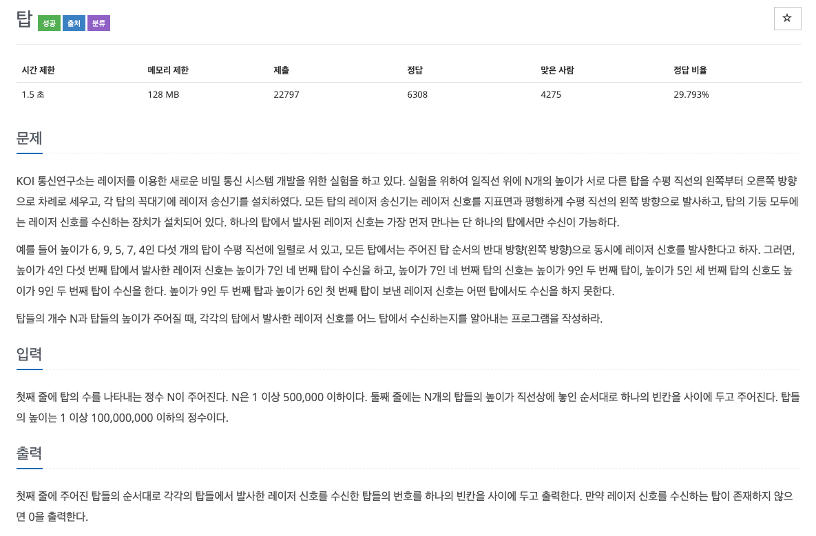 [백준 - JAVA] 스택 - Gold 5 탑 (2493)