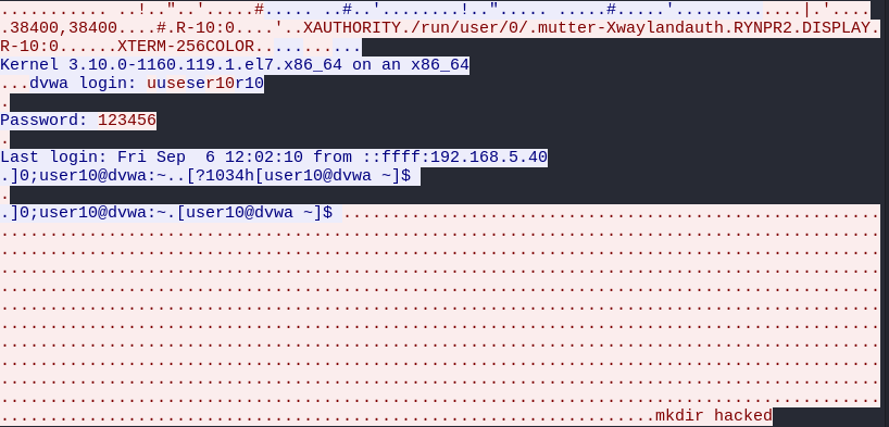 서버의 /home/user10 경로를 확인해보면 hacked 디렉토리가 생성된 것을 볼 수 있다.
