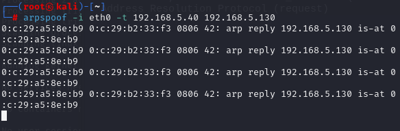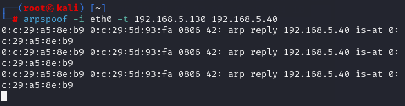 이제 arpspoof 명령어로 타겟의 MAC 테이블에 등록된 서버의 MAC 주소를 해커의 MAC 주소로 변경한다.