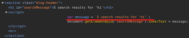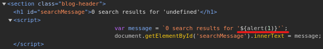 해당 LAB은 blog 검색 기능에 XSS 취약점이 존재한다. reflection은 꺽쇠 기호, 싱글, 더블 쿼터가 HTML 인코딩되어 있고, 백틱(`), 백 슬래시(\)가 이스케이핑된 template string에서 발생한다.