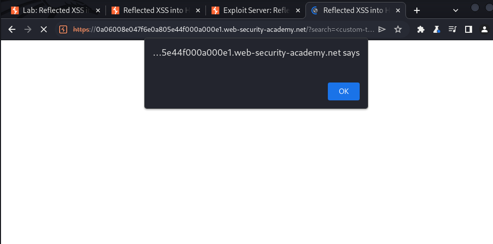 이 LAB은 custom tag를 제외한 모든 HTML tag를 차단하고 있다. LAB을 해결하기 위해서 custom tag를 사용해 자동으로 alert(document.cookie) 함수가 실행되도록 만들어라.