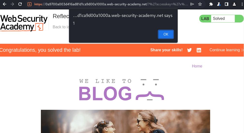 https://0ac000cf0301665f822c06a700b60050.web-security-academy.net/?'accesskey='x'onclick='alert(1)'