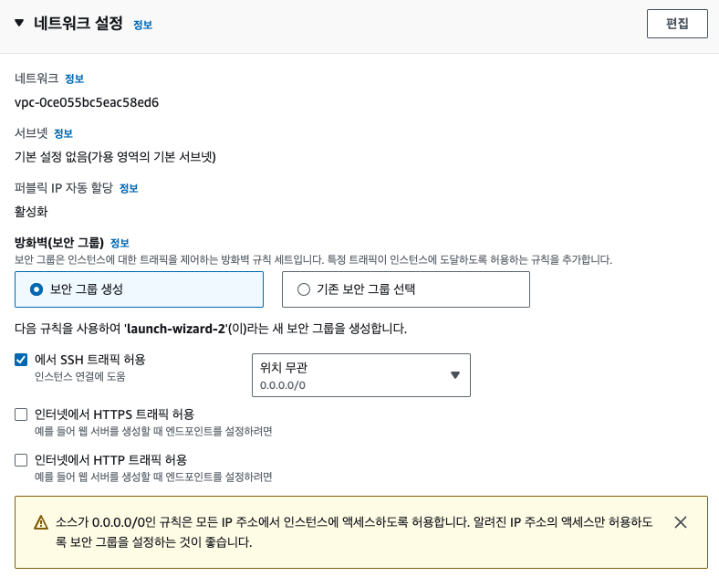 저는 보안 그룹 생성을 하고 SSH 항목을 체크합니다.