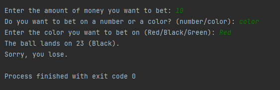 3.사용자가 색상에 베팅하려는 경우, 베팅 금액과 해당 색상을 입력하도록 요청합니다. 색상이 "Red" 또는 "Black" 중 하나인지 확인하고, 해당 색상이 나오면 베팅 금액에 2를 곱한 만큼 보상합니다.