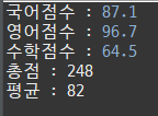 이 때 총점과 평균은 정수형으로 처리하세요.