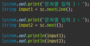 nextLine() : 문자열에 띄어쓰기 가능, 줄구분까지 저장