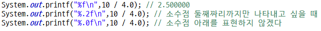 %f : 실수(소수점 아래 6자리), %e : 지수형태표현, %g : 대입 값 그대로