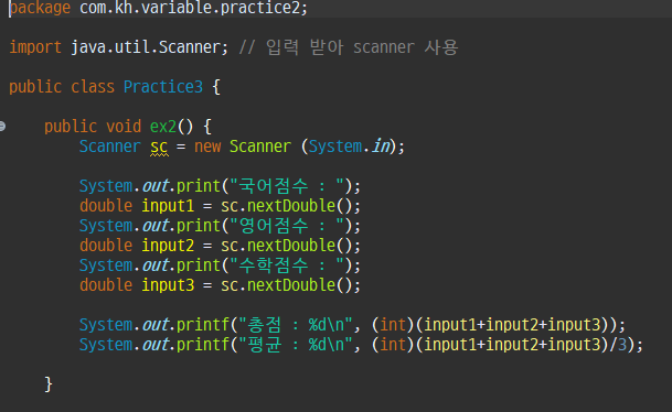 실수형으로 국어, 영어, 수학 세 과목의 점수를 입력 받아 총점과 평균을 출력하세요.