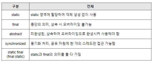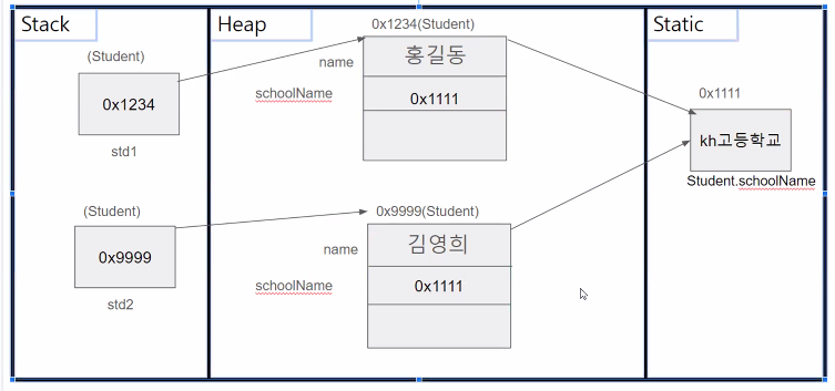 같은 타입의 여러 객체가 공유할 목적의 필드에 사용하며, 프로그램 start시에 정적 메모리(static) 영역에 자동 할당되는 멤버에 적용