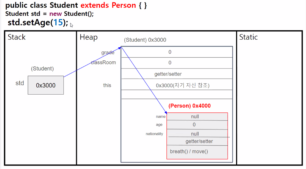 Student std = new Student("김철수", 17, "한국", 1, 3);