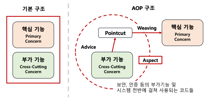 AOP 개념을 적용하면 핵심기능 코드 사이에 끼어있는 부가기능을 독립적인 요소로 구분해 낼 수 있고, 이렇게 구분된 부가기능 Aspect는 런타임 시에 필요한 위치에 동적으로 참여하게 할 수 있다.
