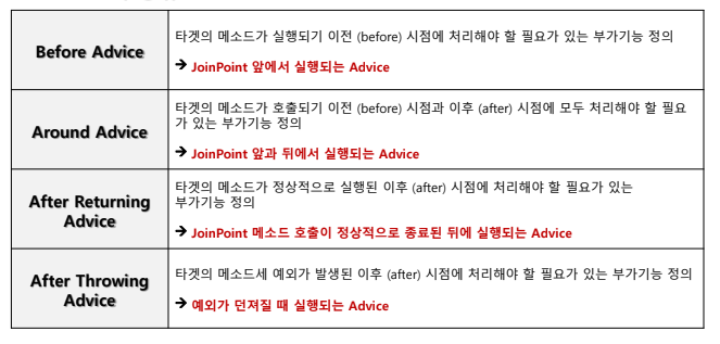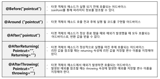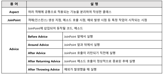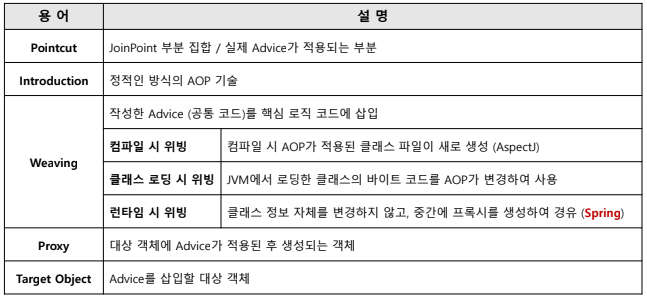 공통되는 부분을 따로 빼내어 작성하는 메소드를 Advice라고 이야기 하며, Advice를 적용될 수 있는 모든 관점(시점, 메소드)을 JoinPoint, JoinPoint 중 실제 Advice를 적용할 부분을 Pointcut, 그리고 그 시점에 공통 코드를 끼워 넣는 작업을 Weaving 이라고 말한다.
