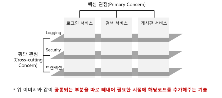 Spring AOP 란, 관점 지향 프로그래밍(Aspect Oriented Programming)의 약자로 일반적으로 사용하는 클래스(Service, Dao 등) 에서 중복되는 공통 코드 부분(commit, rollback, log 처리)을 별도의 영역으로 분리해 내고, 코드가 실행 되기 전이나 이 후의 시점에 해당 코드를 붙여 넣음으로써 소스 코드의 중복을 줄이고, 필요할 때마다 가져다 쓸 수 있게 객체화하는 기술을 말한다.