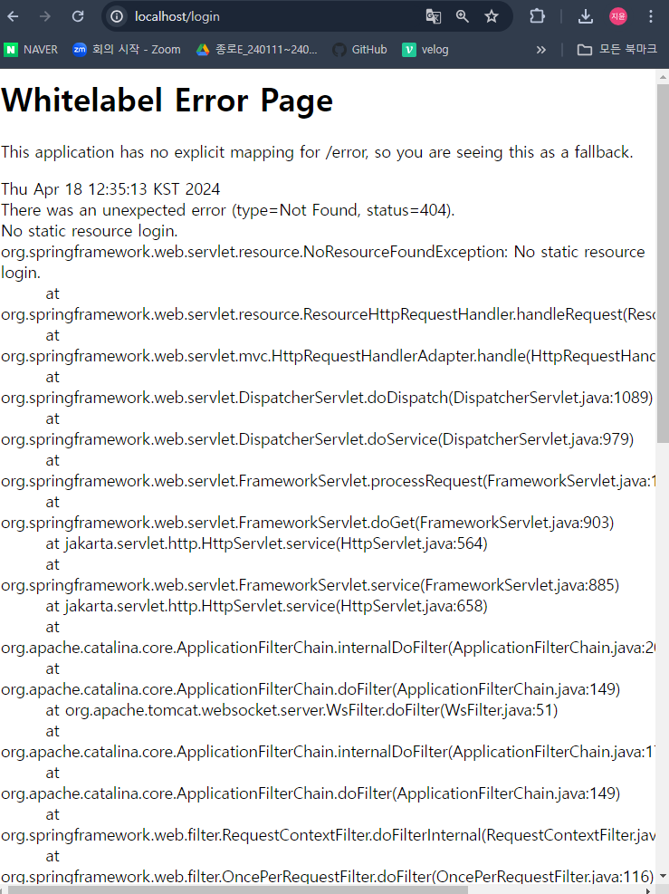 이 코드 작성하고 다시 서버 돌리면 Whitelabel Error Page 뜸