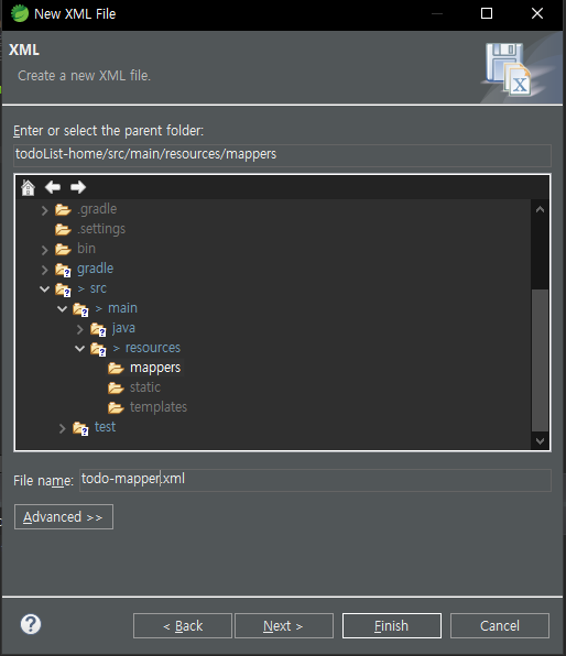 src/main/resources 에 mappers 폴더 만들고 그 안에 mapper.xml 만들어줌