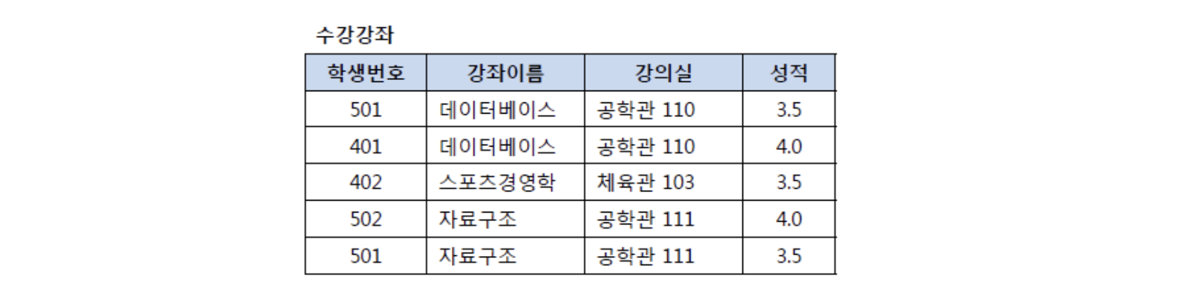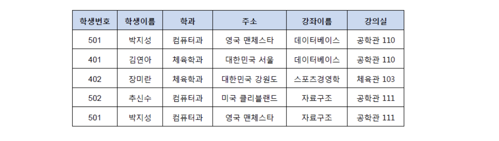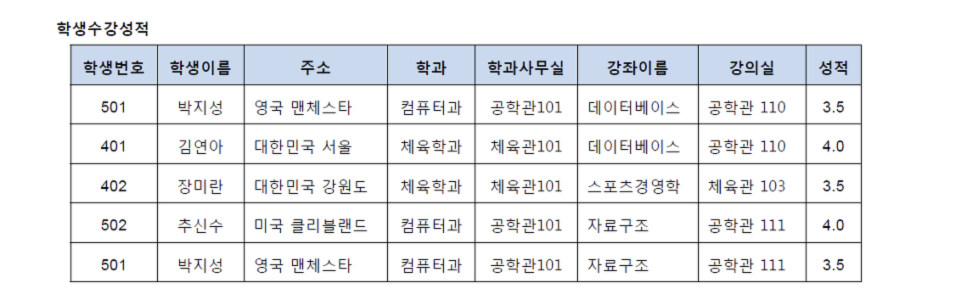 이 복합키로 ‘성적’을 결정하지만, ‘강의실’의 경우 ‘강좌이름’만으로도 결정이 됨