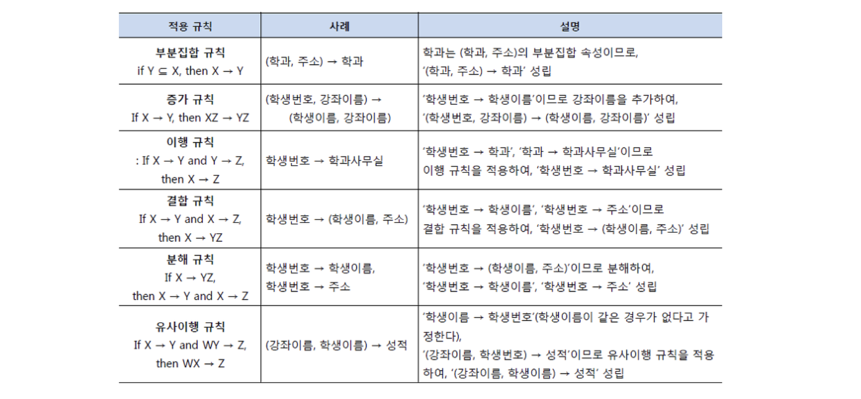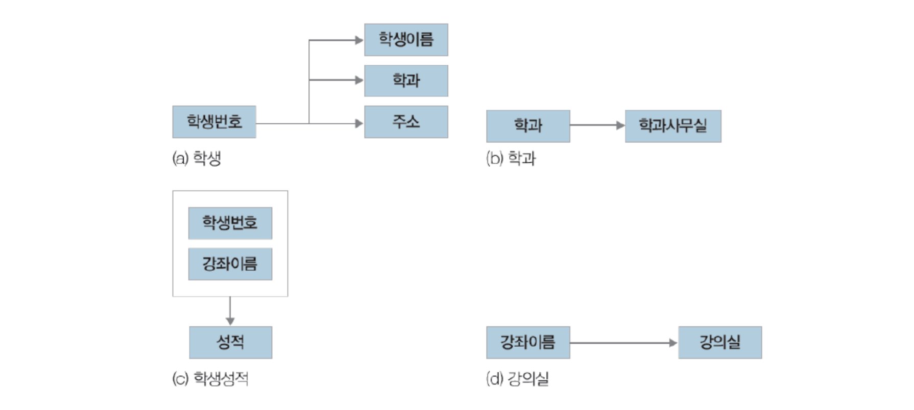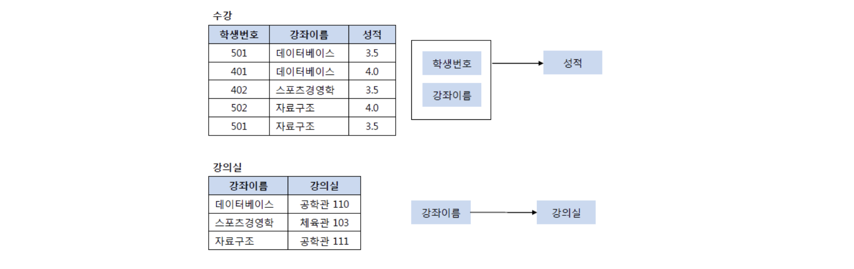 위와 같은 릴레이션에서는 다음과 같은 함수 종속성이 존재함