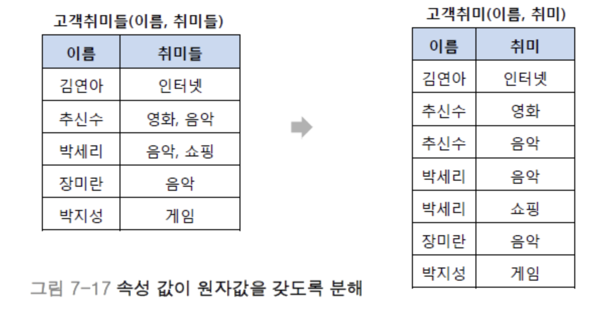 예를 들어 ‘고객 취미’ 릴레이션에 ‘(추신수, (영화, 음악))’ 이라는 데이터가 있다면 ‘(추신수, 영화), (추신수, 음악)’처럼 분리하는 것이 제 1 정규형