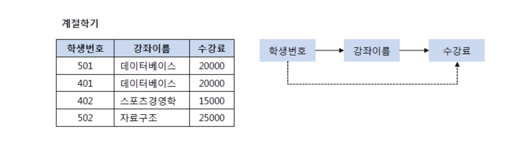 위 릴레이션에서 학생번호 501의 강좌이름이 스포츠경영학으로 변경된다면, 수강료도 15000원으로 변경되어야 함