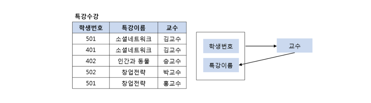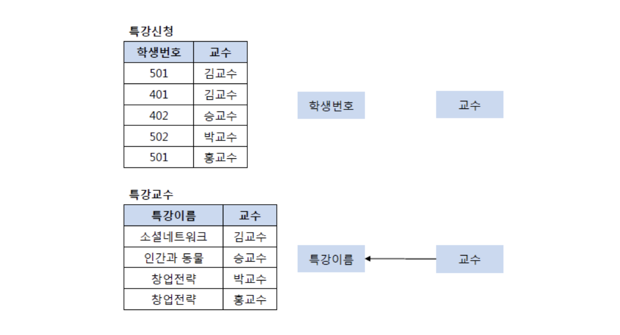 위 ‘특강수강’ 릴레이션에서 기본키는 ‘(학생번호, 특강이름)’이고 교수는 (학생번호, 특강이름)에 완전하게 함수적으로 종속