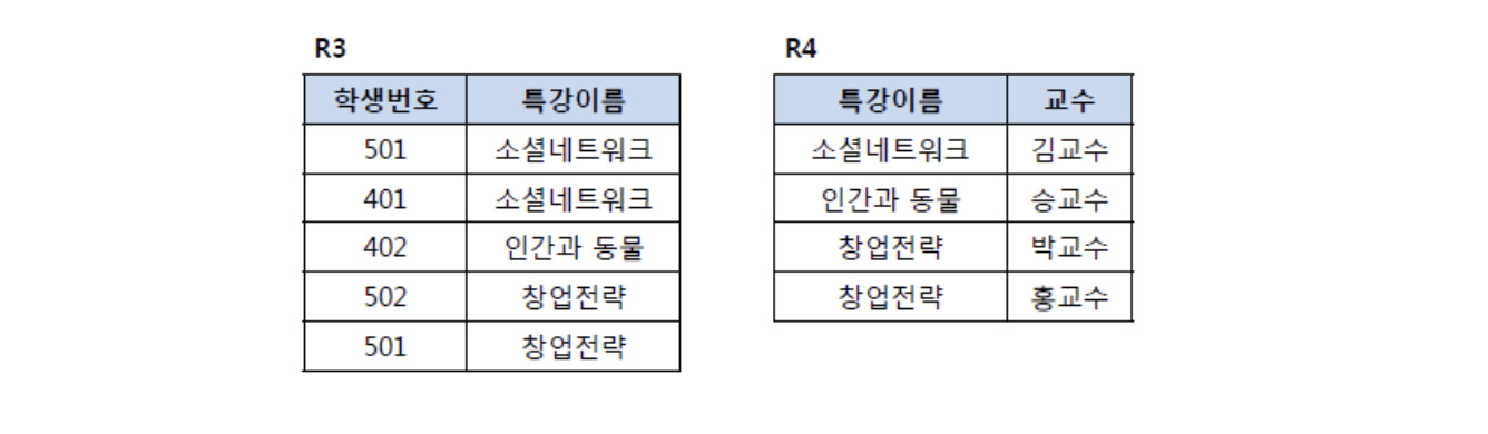 그러나 아래처럼 ‘특강이름’을 기준으로 분리한다면 조인을 한다고 해도 원래의 릴레이션이 되지 않음