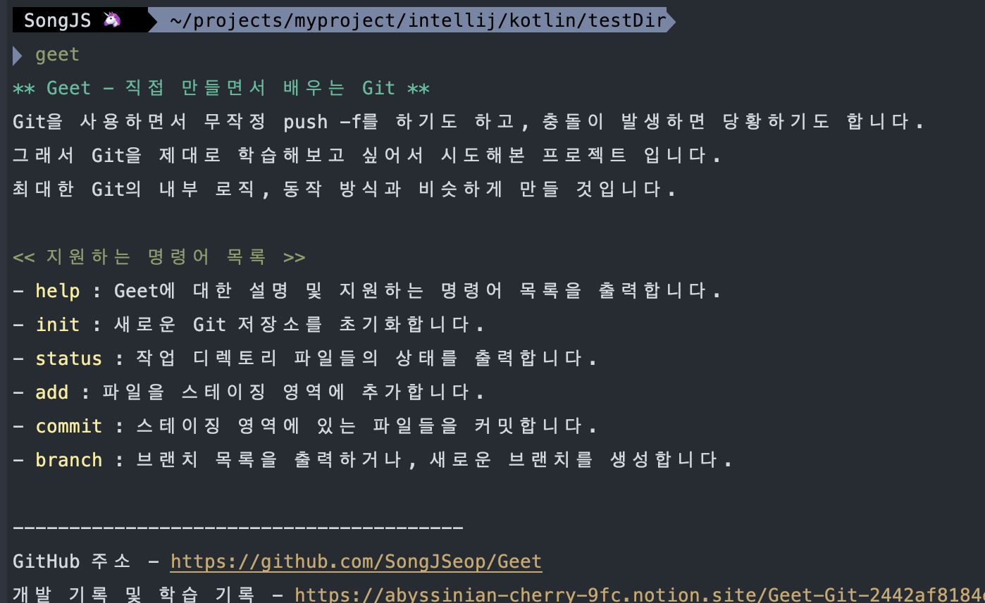 커맨드가 없이 실행하거나 'help' 명령어와 함께 실행하면 geet 프로젝트에 대한 소개 및 사용 가능한 명령어 목록을 출력하려고 하였다.
