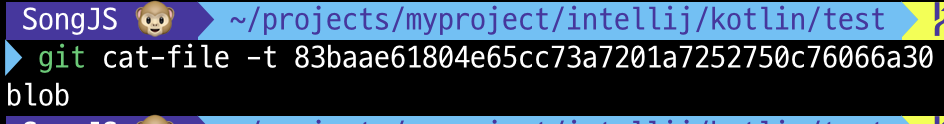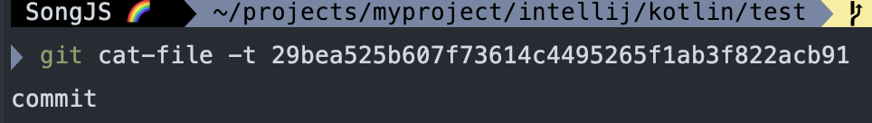 아래와 같이 git cat-file -t 명령으로 SHA-1 key를 입력하면 가리키는 해당 개체가 무슨 개체인지 확인할 수 있음