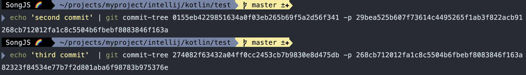 만들었던 tree로 새로운 2개의 커밋을 생성