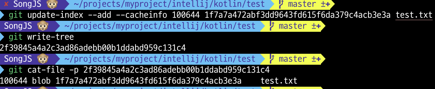 Plumbing 명령인 update-index 명령으로 test.txt 파일만 들어 있는 Index를 만들 수 있음