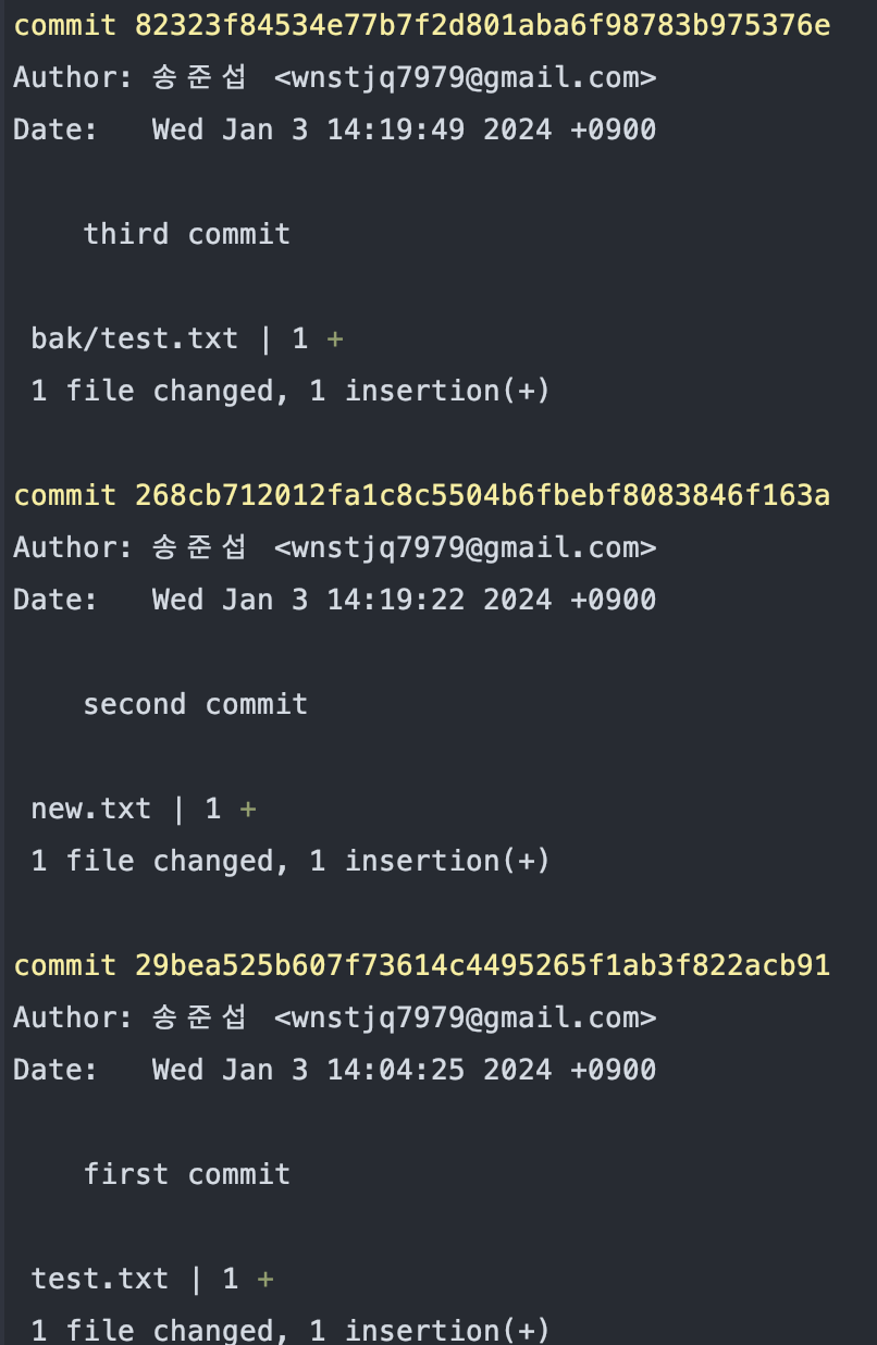 그 후 git log --stat 82323f(마지막 커밋 SHA-1값)를 입력하니 지금까지의 커밋 로그가 찍힘