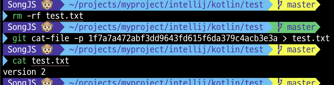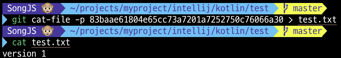 Git 데이터베이스에 개체를 저장하고 나면 이후에는 git cat-file 명령으로 저장한 데이터를 불러올 수 있음