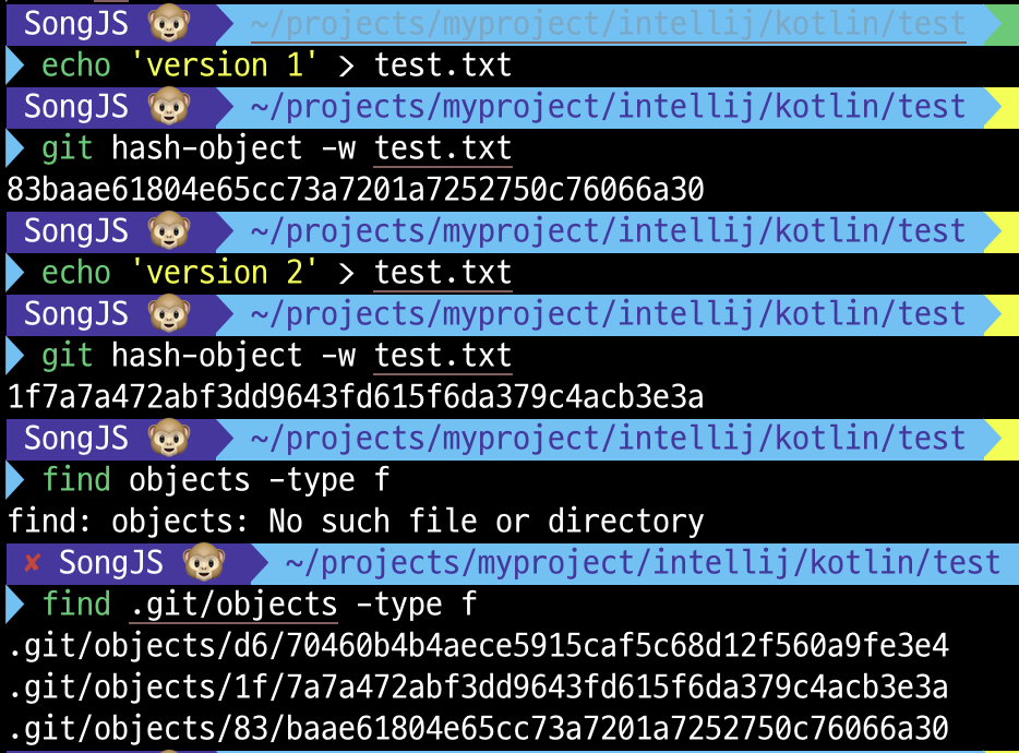 이렇게 test.txt을 생성하고 저장 후, 수정을 한 뒤에 다시 저장하면 위처럼 .git/objects에 새로운 파일 두 개가 추가됨