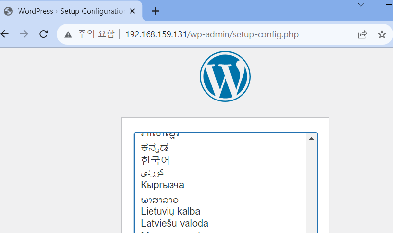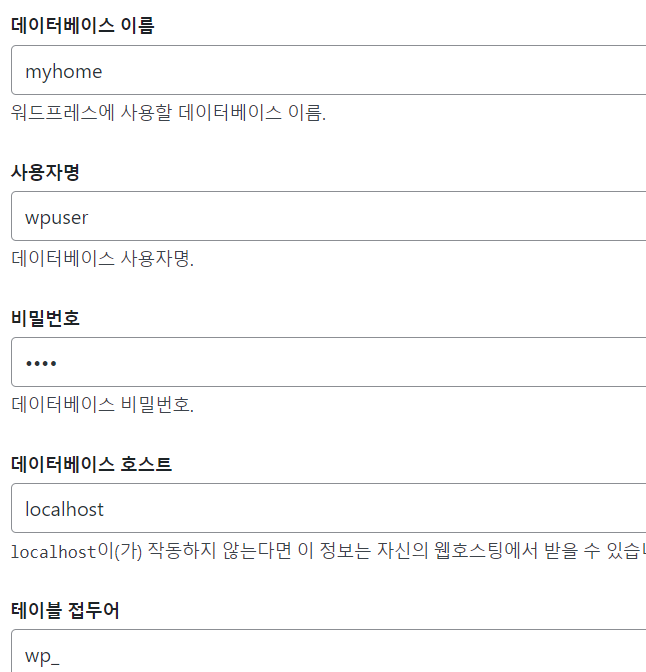 위에 4번 워드프레스 운용 계정을 만든 내용을 참고해서 데이터베이스 이름, 사용자명, 비밀번호 입력