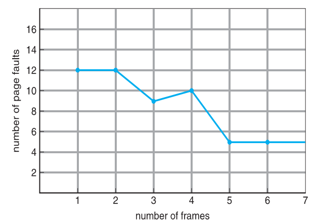 밑에 처럼 frame 개수를 추가하다보면 더 많은 page fault를 야기할 수 있음 -> Belady’s Anomaly