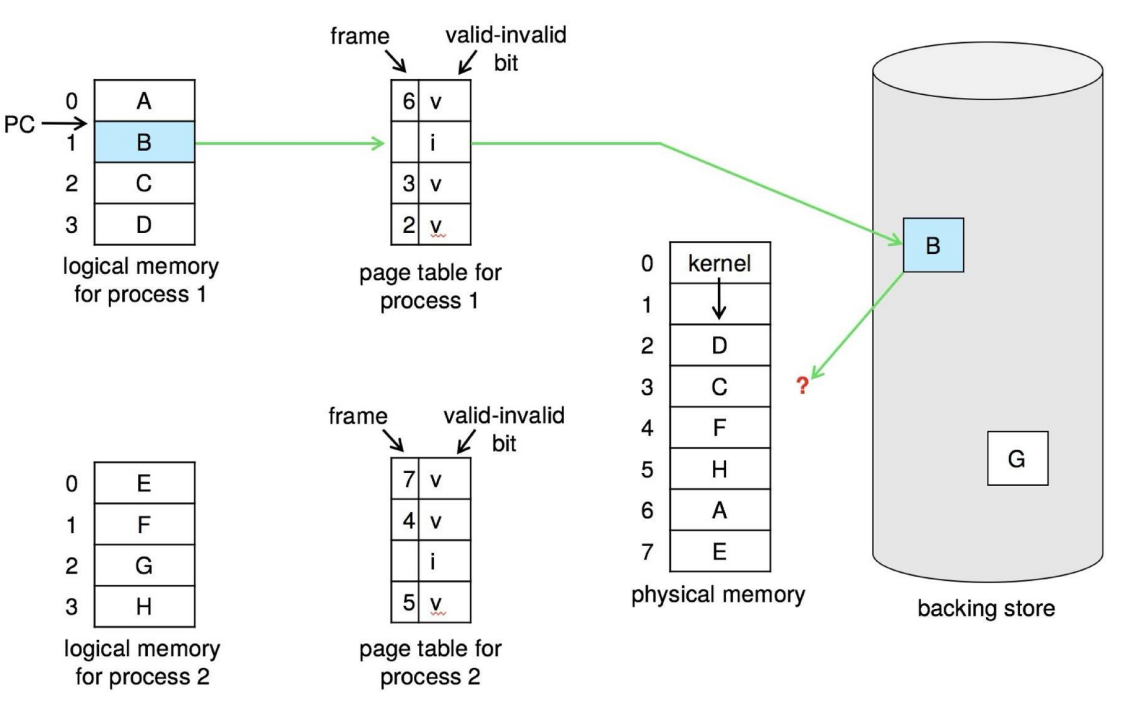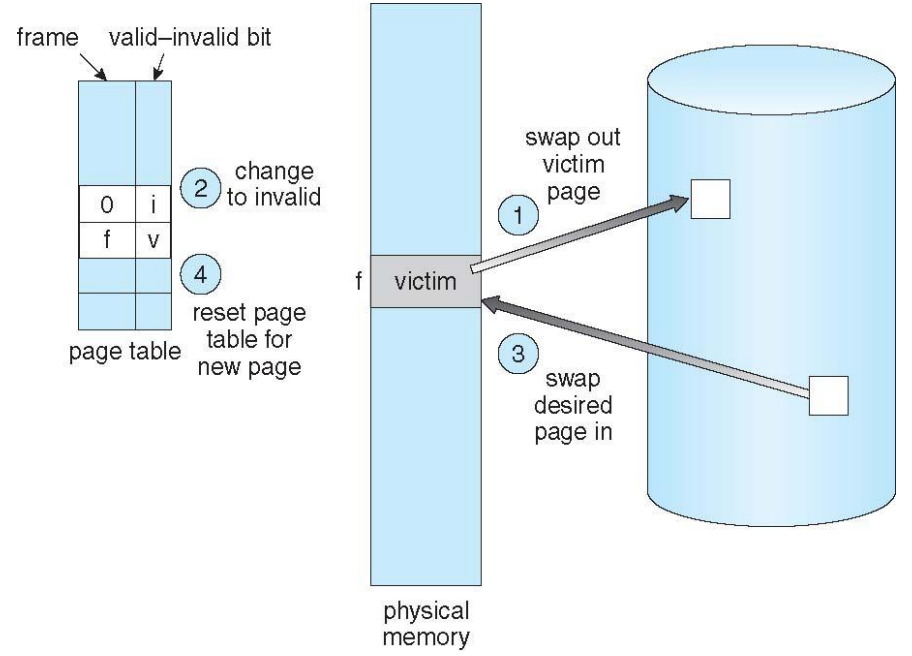 없으면 victime frame을 택하기 위한 page replacement 알고리즘을 돌림