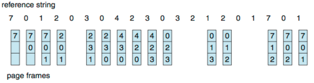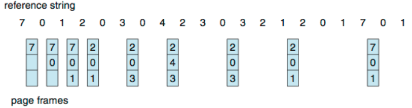 Page-replacement algorithm은 낮은 page fault rate을 지향하며 어떤 프레임이 교체될지를 정함
