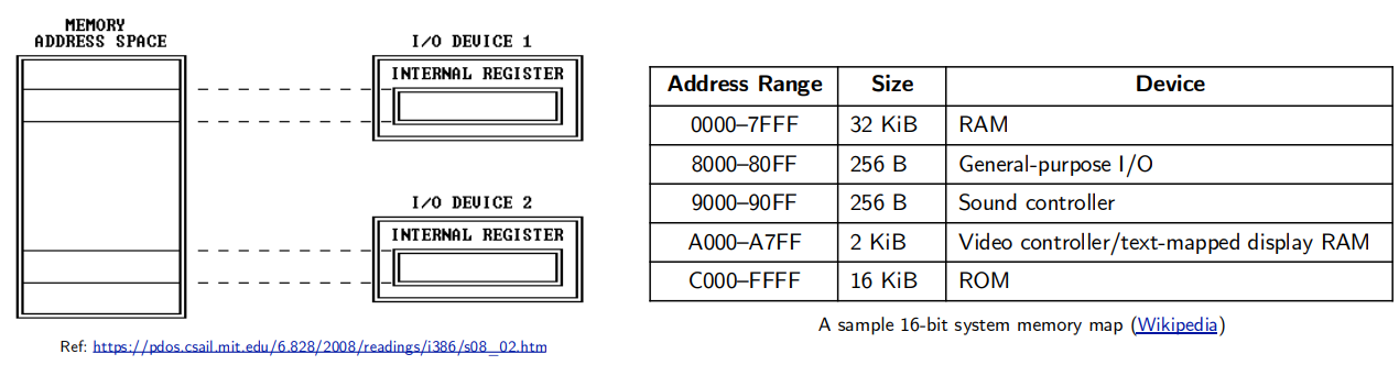 Memory-mapped I/O 각 장치 레지스터에 메모리 주소를 매핑하고 해당 주소를 사용하여 레지스터에 접근함