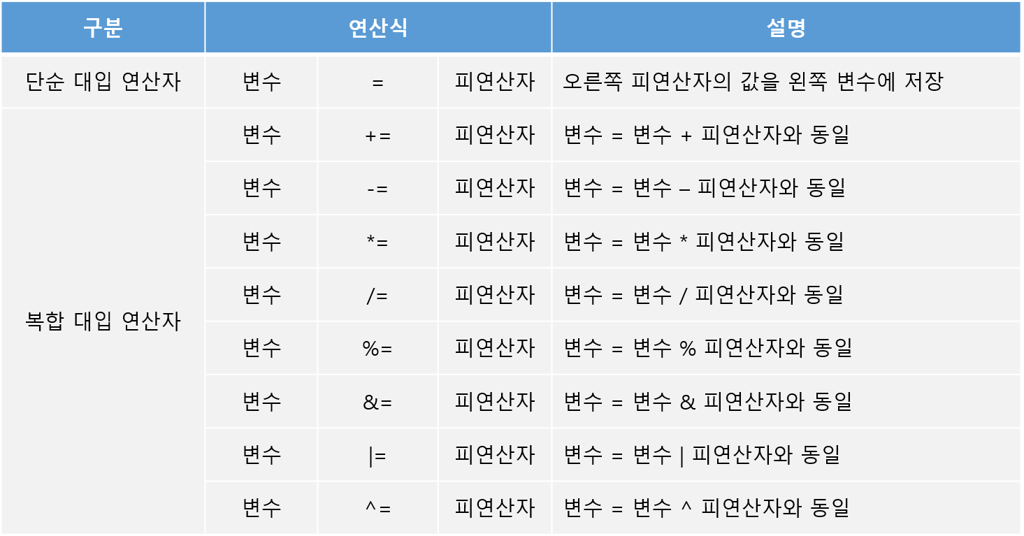 대입 연산자는 오른쪽 피연산자의 값을 왼쪽 피연산자인 변수에 저장한다. 오른쪽 피연산자에는 리터럴 및 변수, 다른 연산식이 올수있다. 단순히 오른쪽 피연산자의 값을 변수에 저장하는 단순 대입 연산자가 있고 정해진 연산을 수행 후 결과를 변수에 저장하는 복합 대입 연산자도 있다.