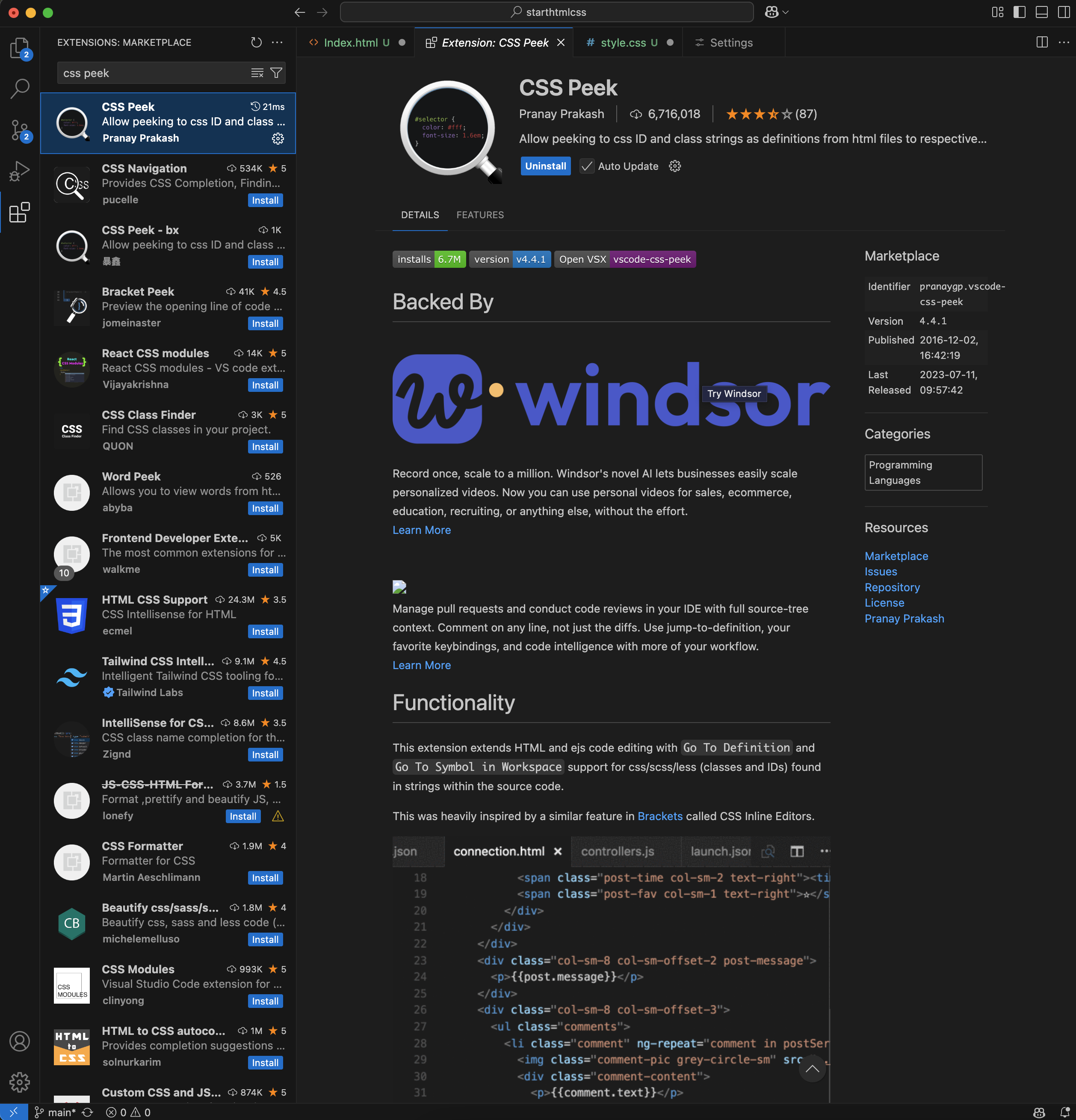 다음은 CSS Peek이다. 이를 이용하면 어떤 스타일을 사용했을 때, 이 스타일 규칙이 어디에 정의되어 있는지 cmd + mouse click으로 찾을 수 있는 extension이다.