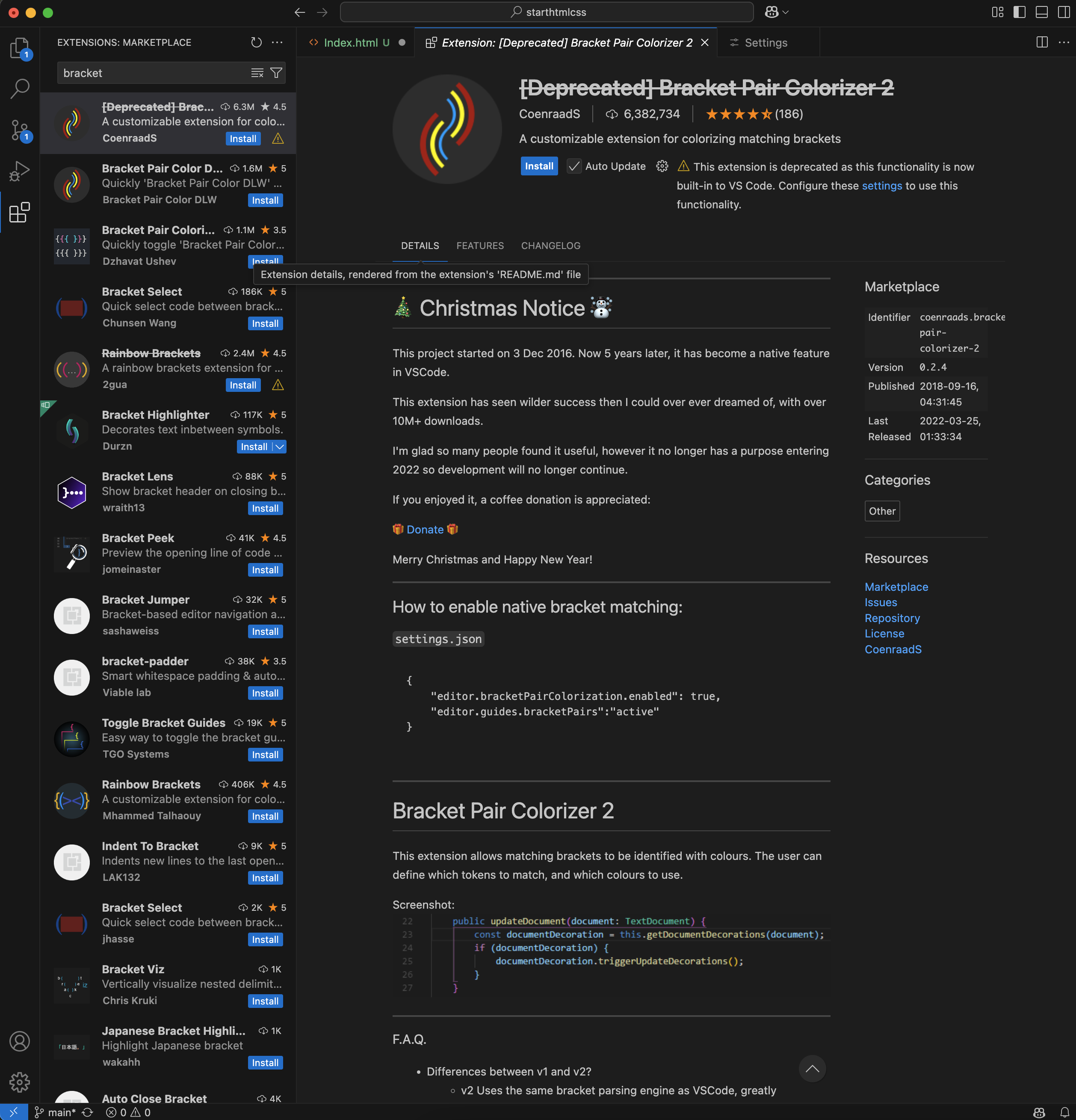 다음으로 bracket pair colorizer2이다. 이건 설치하려고 봤더니 이제는 built-in되어 그냥 적용되어 있다고 한다. 설치하지 않아도 괄호를 색깔로 구분하기 쉽게 된 것이다.