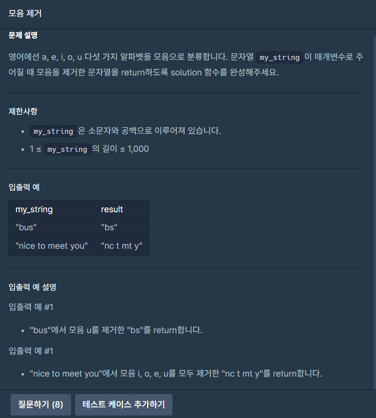 인수로 받은 문자열(my_string)에서 모음에 해당하는 요소를 제거하고, 문자열 형식으로 return하는 함수를 만드는 것입니다.