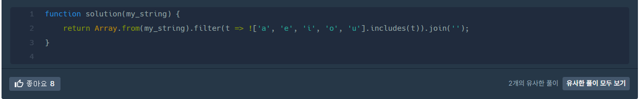 그리고 (t => !['a', 'e', 'i', 'o', 'u' ].includes(t))라는 표현을 처음 접했다.