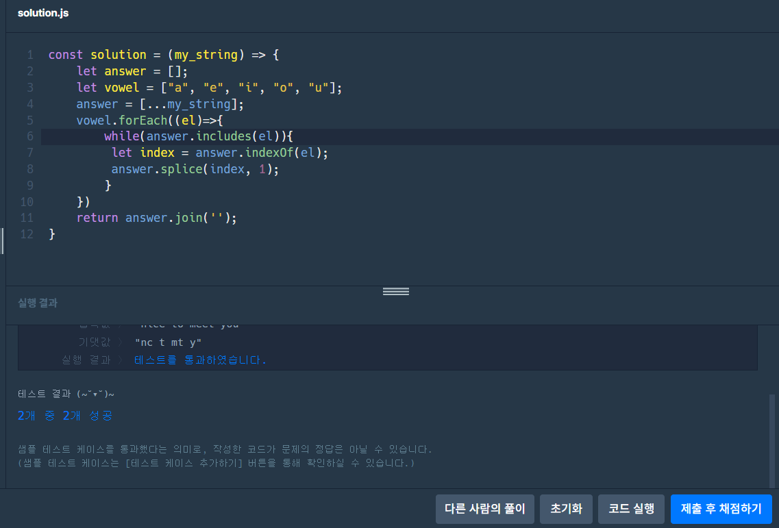 모음에 해당되는 요소가 있다면(includes) 그 요소(indexOf)를 제거(splice)하고