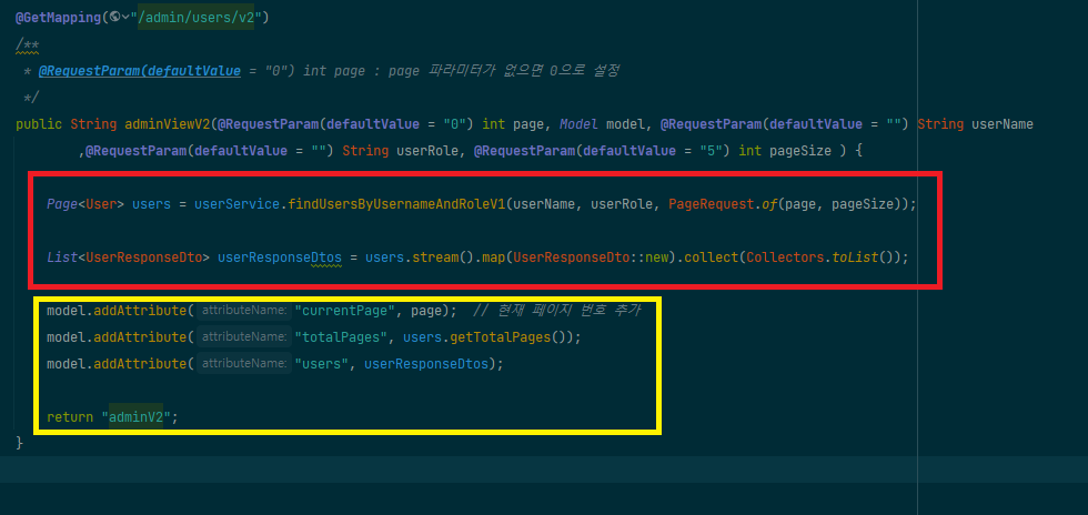public String adminViewV2(@RequestParam(defaultValue = "0") int page, Model model, @RequestParam(defaultValue = "") String userName
