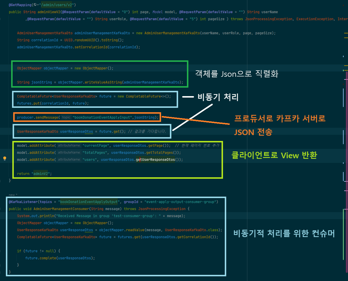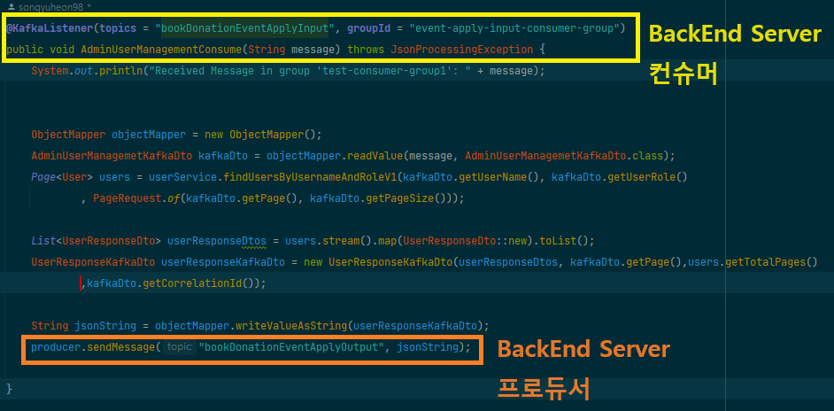 빨간 상자는 Back의 서버에서 관리하고 노란 상자는 front의 컨슈머에서 던져주는 형태로 하면 어떨까?