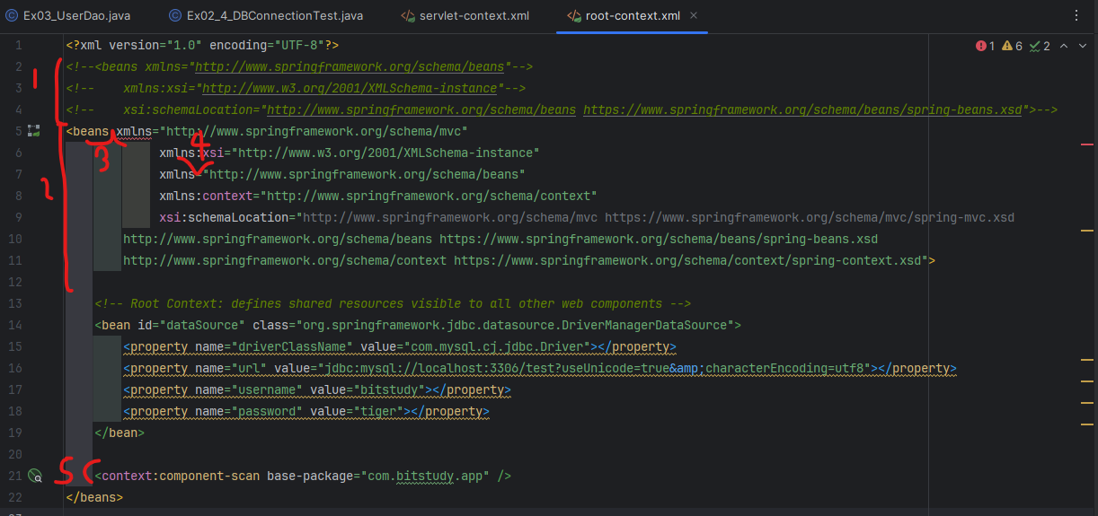 servlet-context.xml의 맨 위 <bean 부분이랑, <context:component-scan base-package="com.bitstudy.app" /> 복사해서 root-context.xml에 넣기.