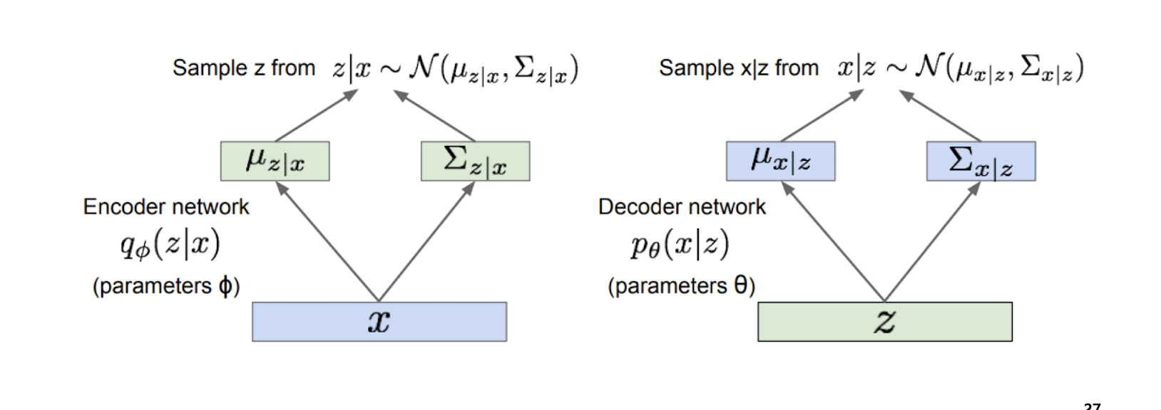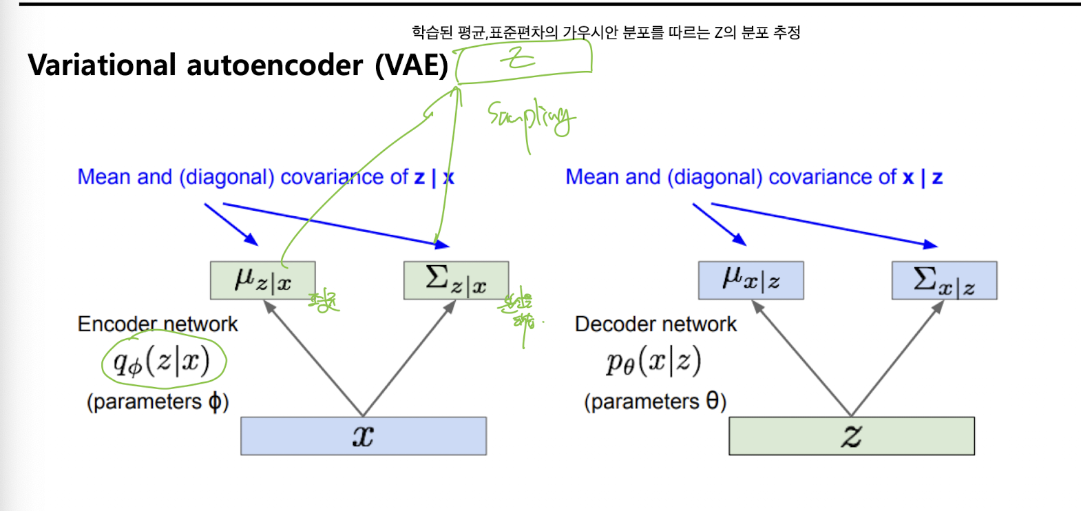- μz∣x, Σz∣x: z의 평균과 분산(공분산행렬), 각각 인코더 신경망의 출력값