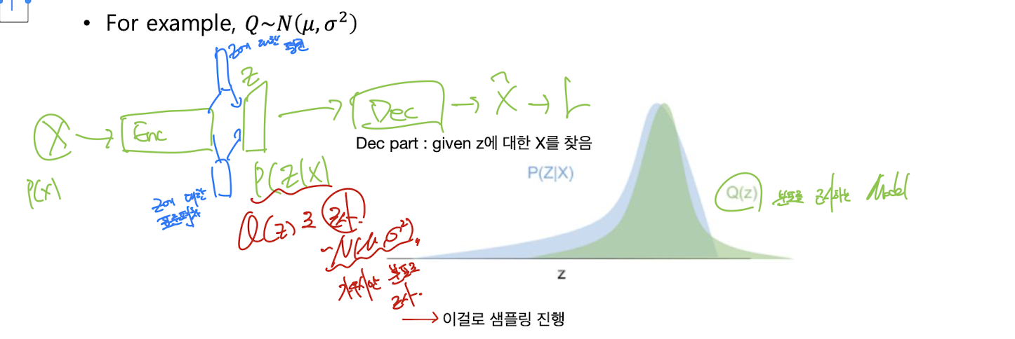 → 예를 들어, Q는 평균 μ, 분산 σ2를 갖는 정규분포로 가정할 수 있음. 즉, 인코더가 X에서 z의 평균과 분산을 구하고, 그걸로부터 z를 샘플링함.